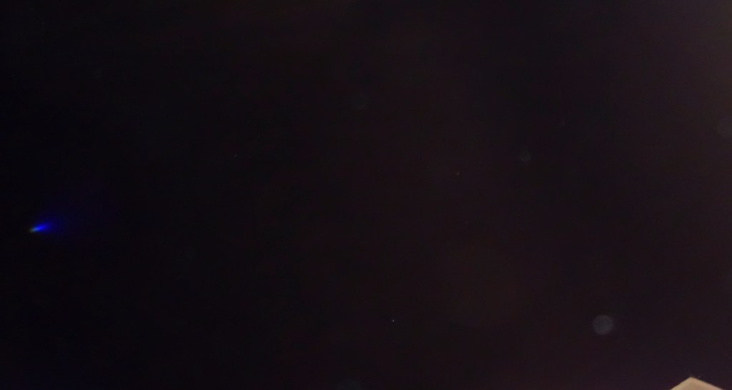The night of March 21st, while connecting with the Lei’hua lightship overhead and asking if she could decloak, the ship gave a huge light flash from just above Canopus, in her signature peachy rosegold colour, incredibly bright and sending rays outward. Then after a few minutes the Lei’hua gave this smaller flash over near Orion, still in golden-white peach tones, and in the photo you can see golden light above and rose light below, rimming the ship’s disc shape.