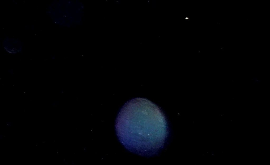 A large planet-like orb then appeared between Achernar and the upper star of the triangle, followed by a gorgeous emanation from a ship, with the distinct shapes of two aqua-green butterflies in its foreground.