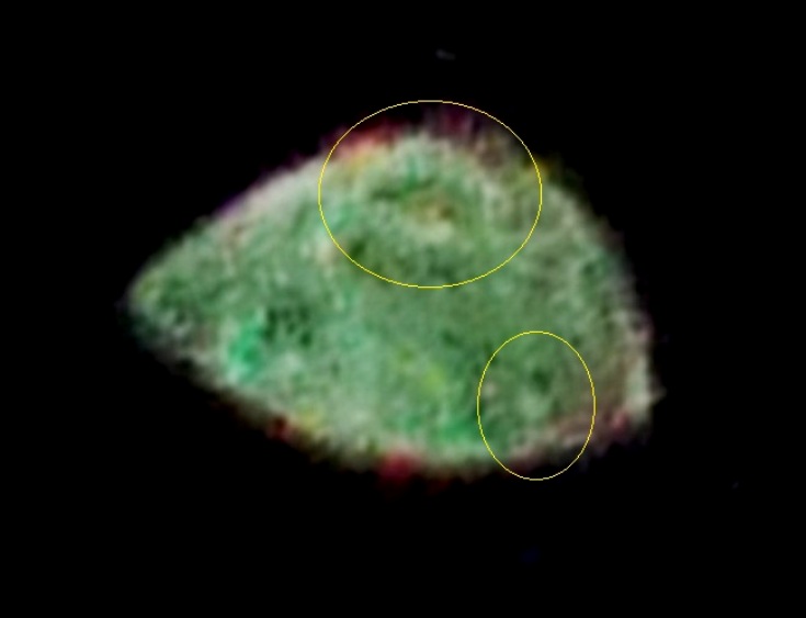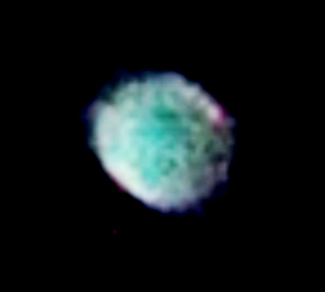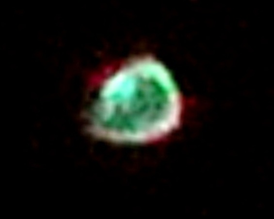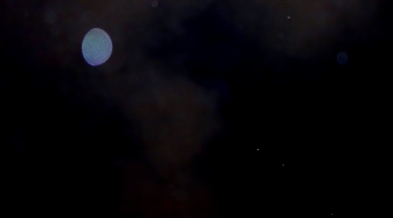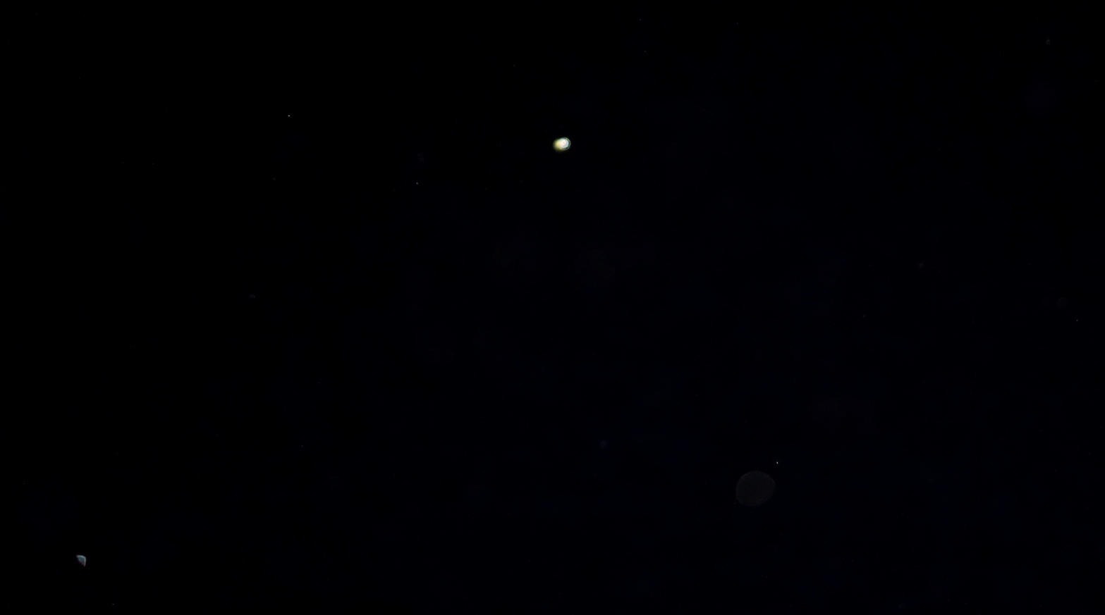 This was followed by a line-up of orbs between Sirius and Canopus, with red orbs between the two stars, and a green orb to the right of Canopus. Enlarged, there are figures visible in the green light emanation, quite clear with the contrast increased.