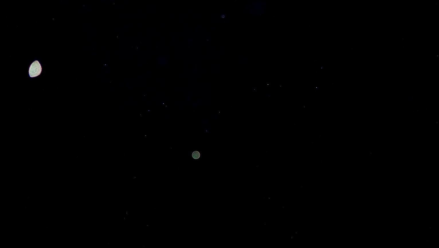On August 11th, a beautiful ” duo orb choreography” unfolded, beginning with one large blue-violet orb floating to the upper left of Alpha and Beta Centauri.