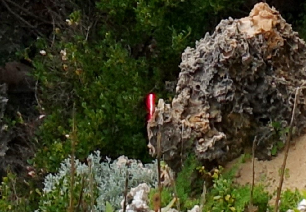 The next morning, on August 29th, while attuning with the Terebinth lightship of the Tara fleet above the coast at Hall’s Head in Mandurah, a ruby beam flashed downward, and can be seen ”landing” among limestone outcrops as an intensely bright red-white vertical light beam (visible for only a second, but recorded at the moment of grounding into the earth in the photo below, circled at the foot of the frame).