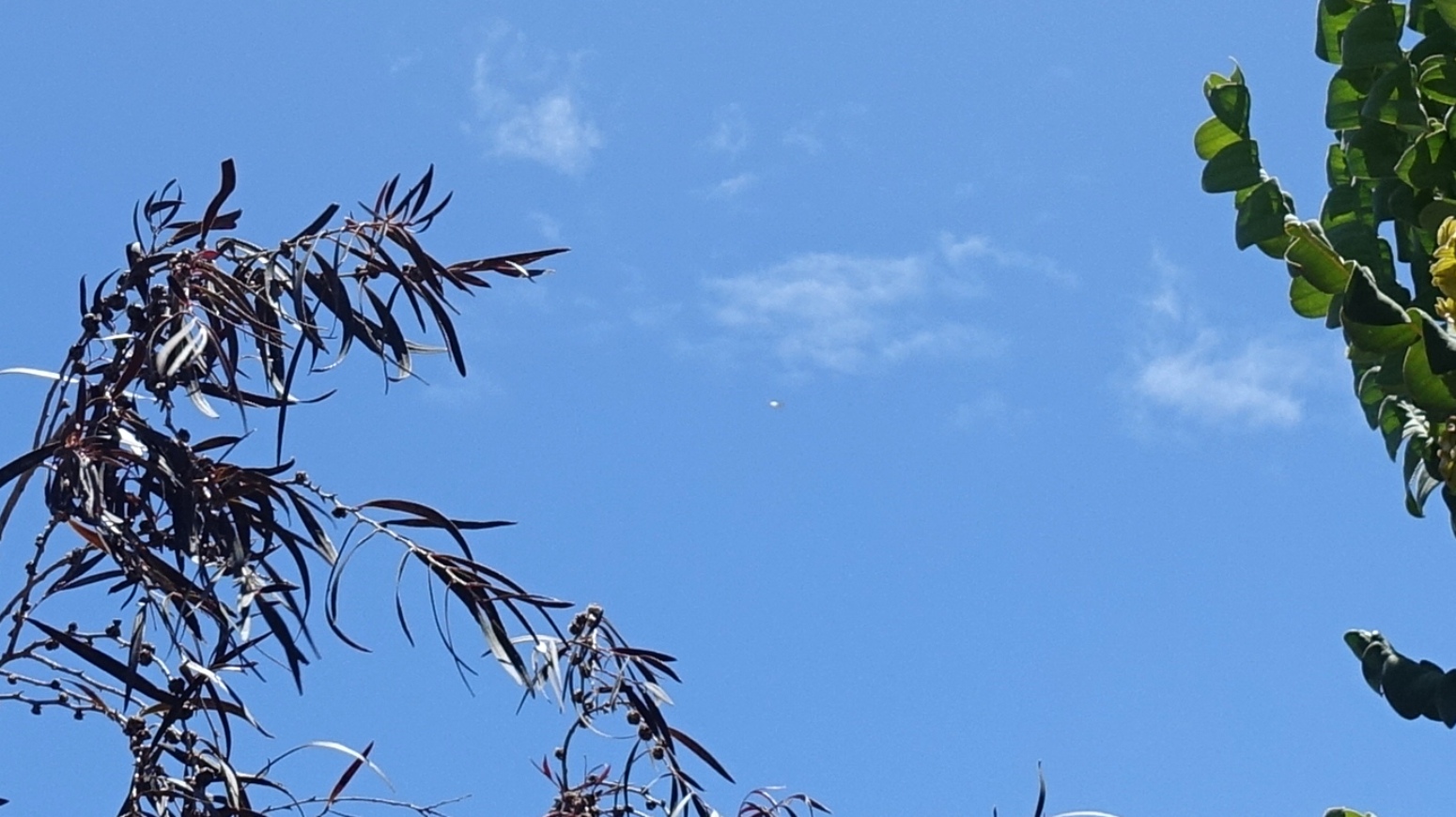 November 30th was busy in the skies both day and night, with visible diamond light flashes and sparkles across the sky, while several planes flew overhead. I was seeing/feeling an energy clearing going on around these planes, and a dark cylinder shape can be seen tailing the plane below, before Arnap flashed his pod-ship – small, spherical white lightship – above the plane and cylinder, and the cylinder disappeared (was removed) from behind the plane. He flashed again, brilliant diamond-white light, for a moment lower down between the trees, and you can see etheric shadowy energy congealing around his ship, which he was drawing in and transmuting back to light.