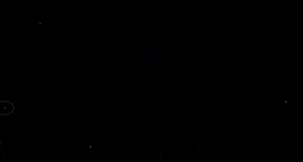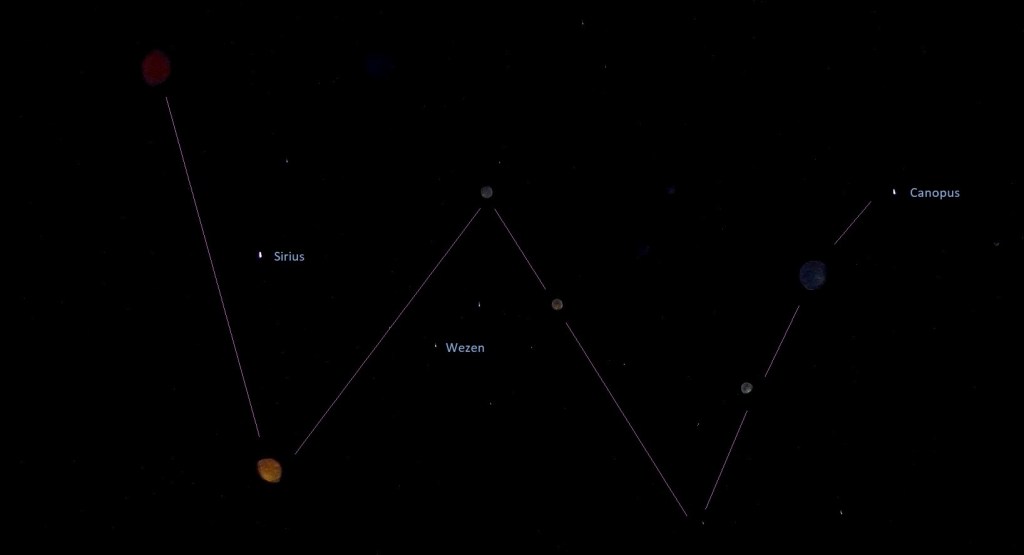 As in 2023, this year has come in with a lot of activity around the two brightest stars in the nightsky, Sirius and Canopus, but this year with a focus that has increased sequentially through January and February around a group of stars known as the Hu Shi Asterism (Bow & Arrow), which sit between Sirius and Canopus, with four major stars comprised of three stars of the Canis Major constellation (of which Sirius is the alpha star) and a star of the Puppis constellation, which we’ll ‘zoom in on’ below. The first star of the Bow & Arrow I was drawn to focus with is called Wezen (which means ‘weight’ in Arabic), and this focus was immediately accompanied by the appearance of amber-gold-orange coloured lightships and orbs around that area. Here are the first, from January 2nd, with two orbs followed by a ship (mostly decloaked apart from its left tip).