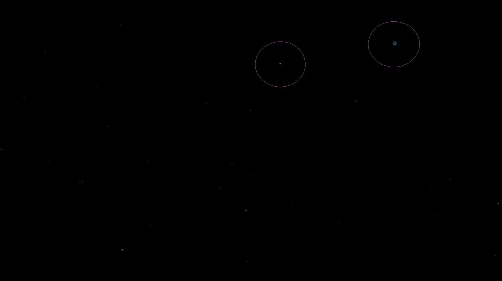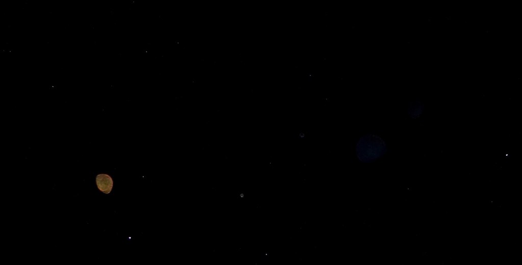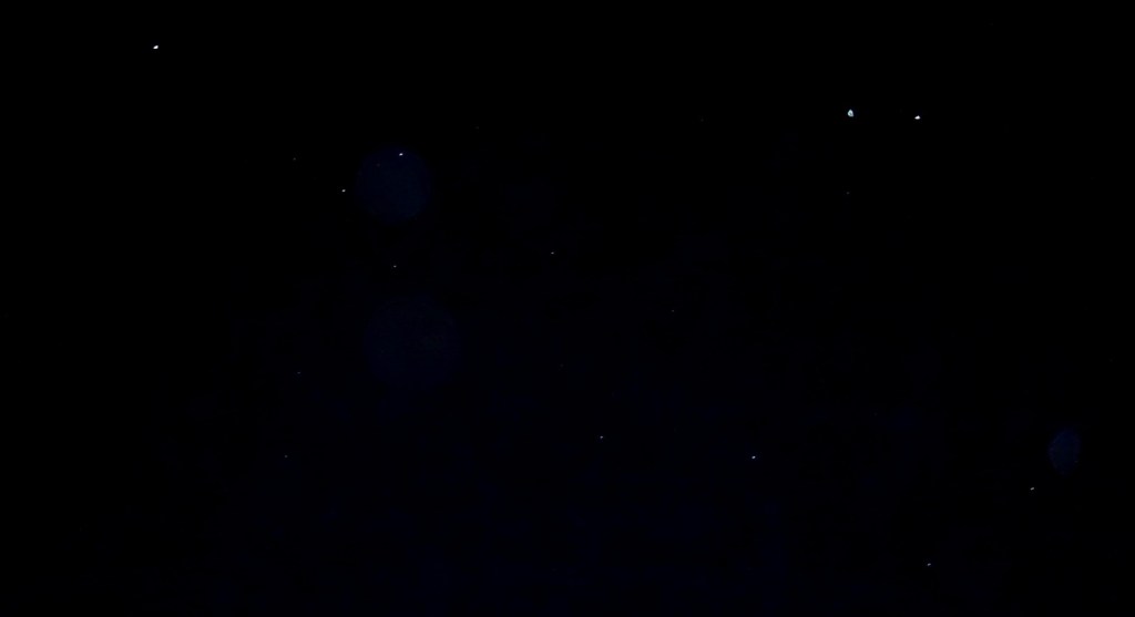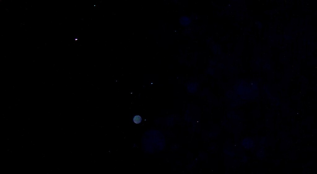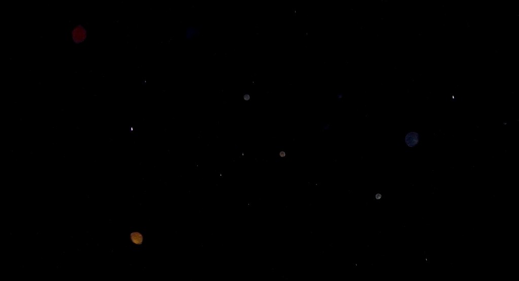 Here’s another arc of four orbs from that night, this time arcing over Sirius and the Hu Shi stars, with the lower right star in front of/surrounding the star Ahadi (Pi Puppis), and a ‘guiding’ blue orb flowing with them close above.