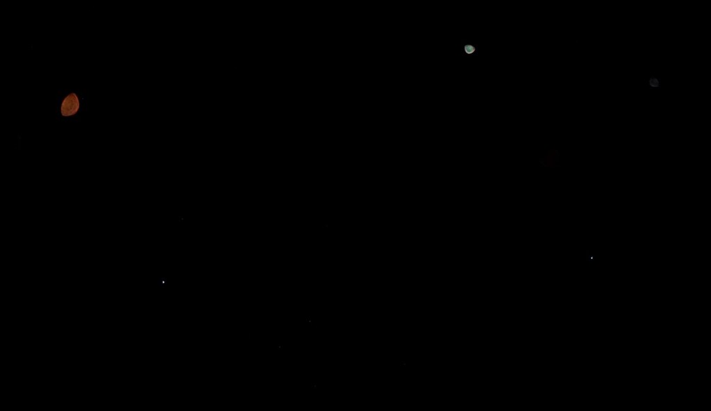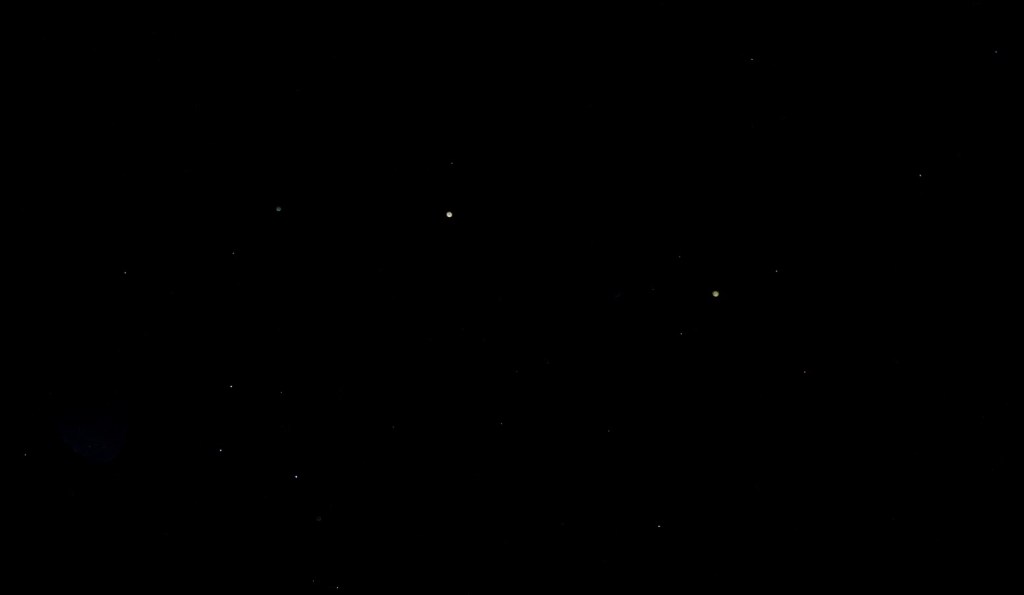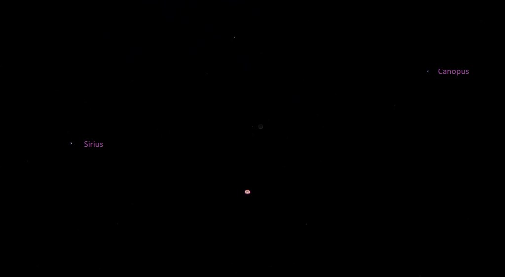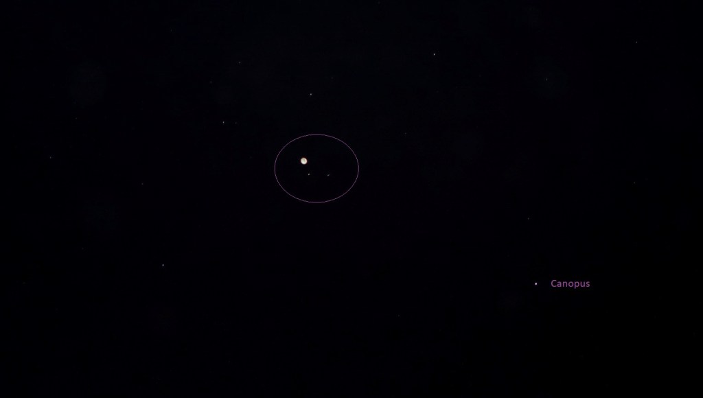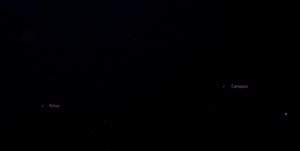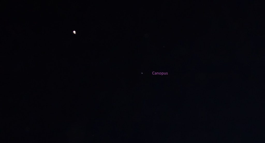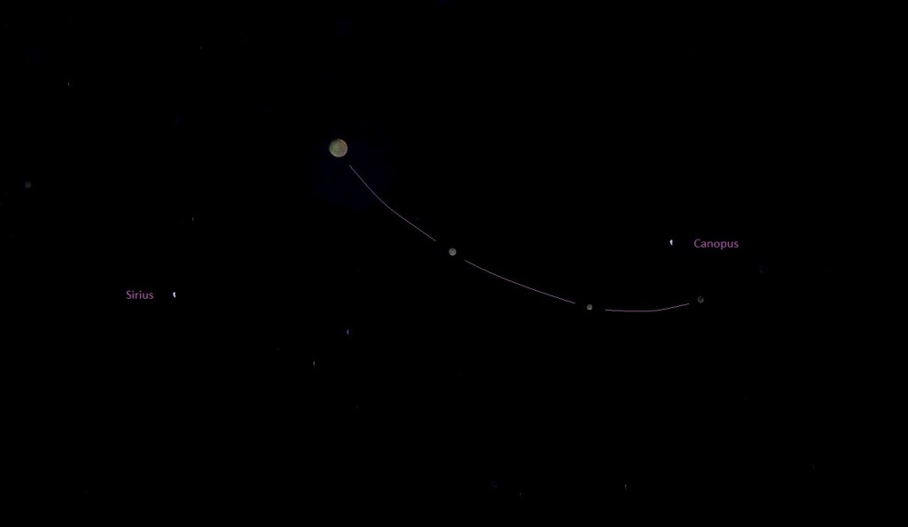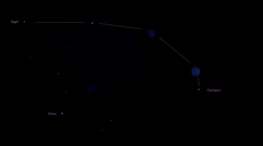 Then a beautiful arc of four orbs in perfectly graduated sizes formed between the Bow & Arrow stars and Canopus.