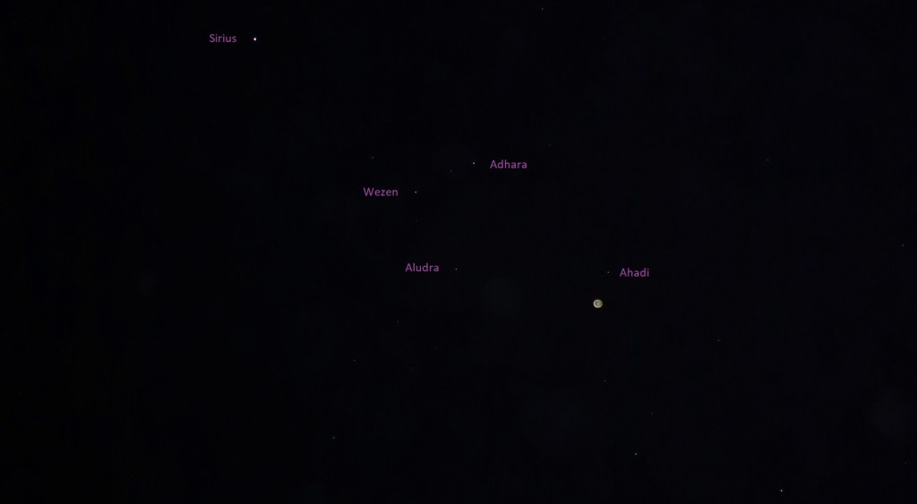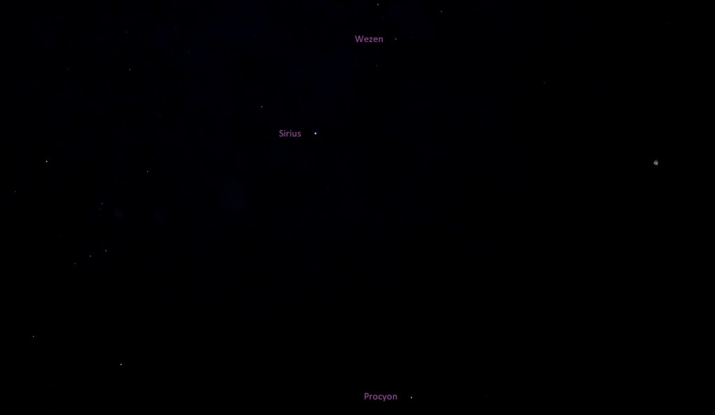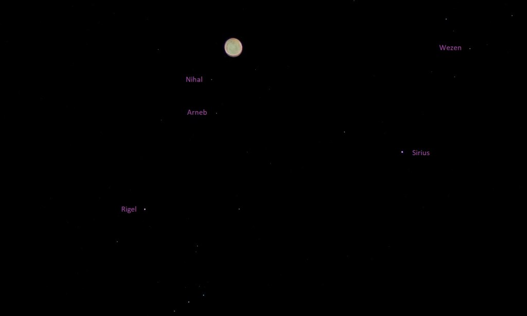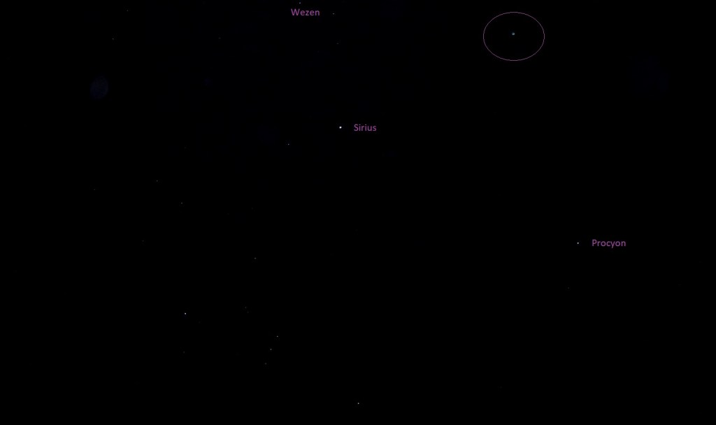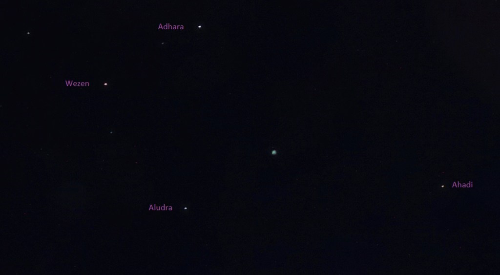 On January 16th, a brilliant green lightship flashed very close to Wezen, followed by a lovely green-gold orb rimmed in a peachy tone, left of Wezen.