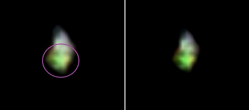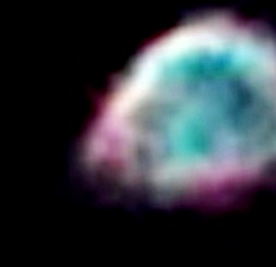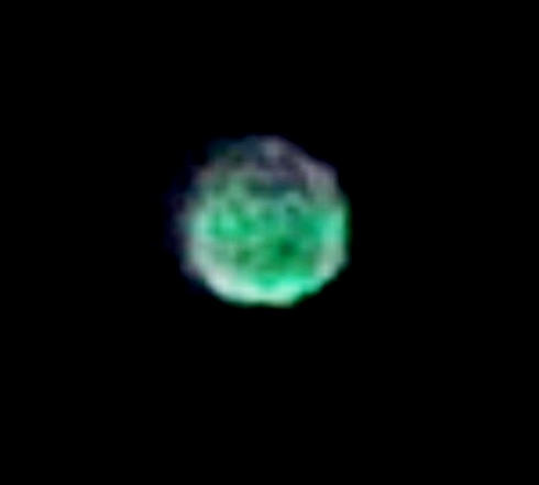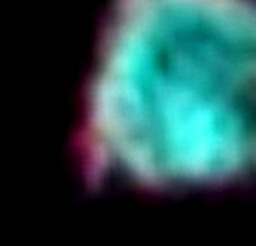 Note the position of these two orbs above Sirius and Canopus, and then swinging in next to the stars. The smaller green orb, enlarged below, shows figures in the lower right foreground, and pyramid-like shapes in the background.
