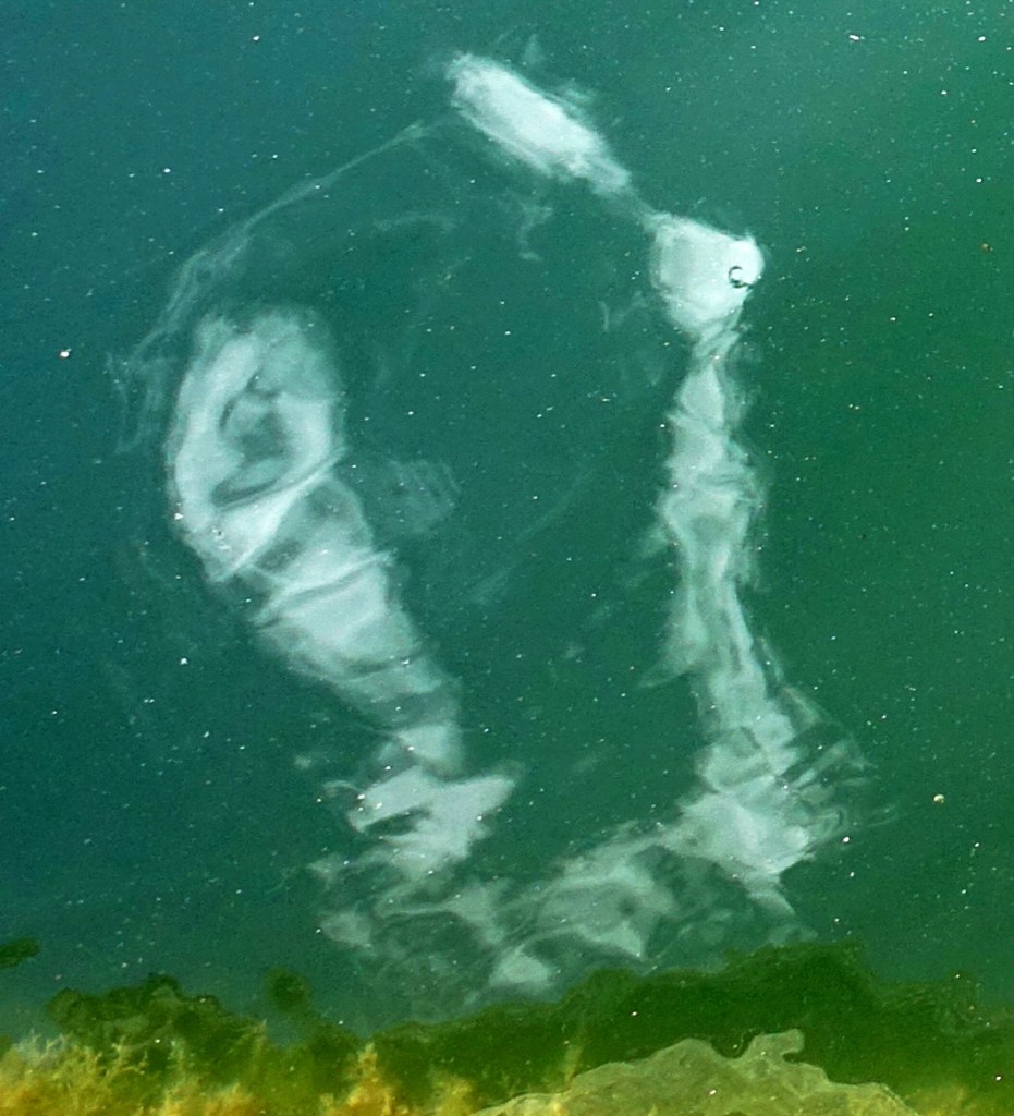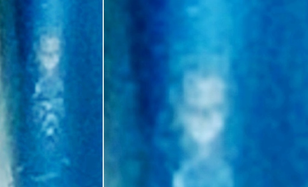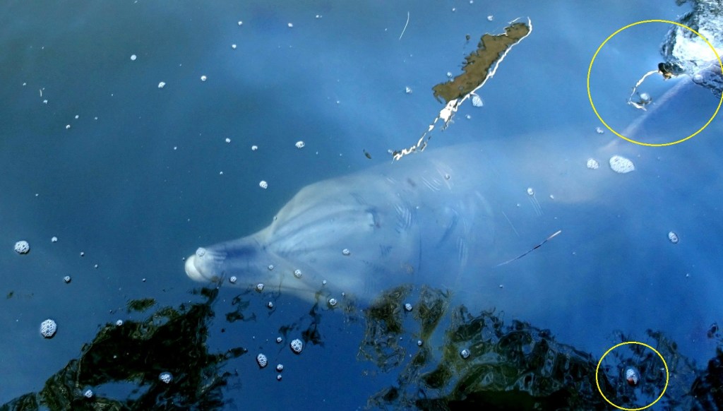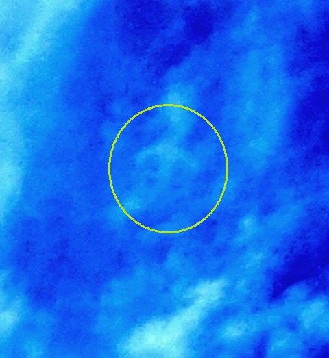 On April 23rd, another dolphin encounter came with a ship (the Lei’hua) fully decloaked for a moment, in the direction this young dolphin swam toward me in the Mandurah Marina, with a feeling of distress vibrating from him. By the time I turned my camera toward him and the Lei’hua, the ship had recloaked, with just a hint of its presence reflected in a ring of four tiny clouds arranged in a disc-shape where the ship was hovering. The little dolphin had an open wound on his dorsal fin and two long scuff marks across his upper body. A wonderful healing unfolded then, that I’ll share in more detail in a post soon. In brief, beautiful energies flowed in, and within minutes, the lovely dolphin’s dorsal fin had completely healed, without a mark, and the scuff marks become fainter, and he became very joyful, doing underwater acrobatics, and forming the ‘nebula image’ below, with a pyramid shape and subtle facial overlays within it. I’ve circled where the Lei’hua decloaked in the first photo.