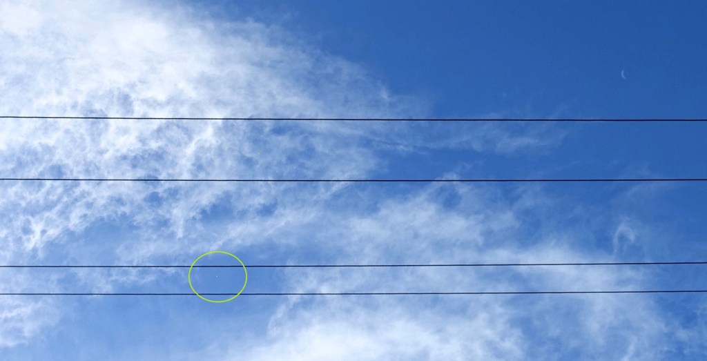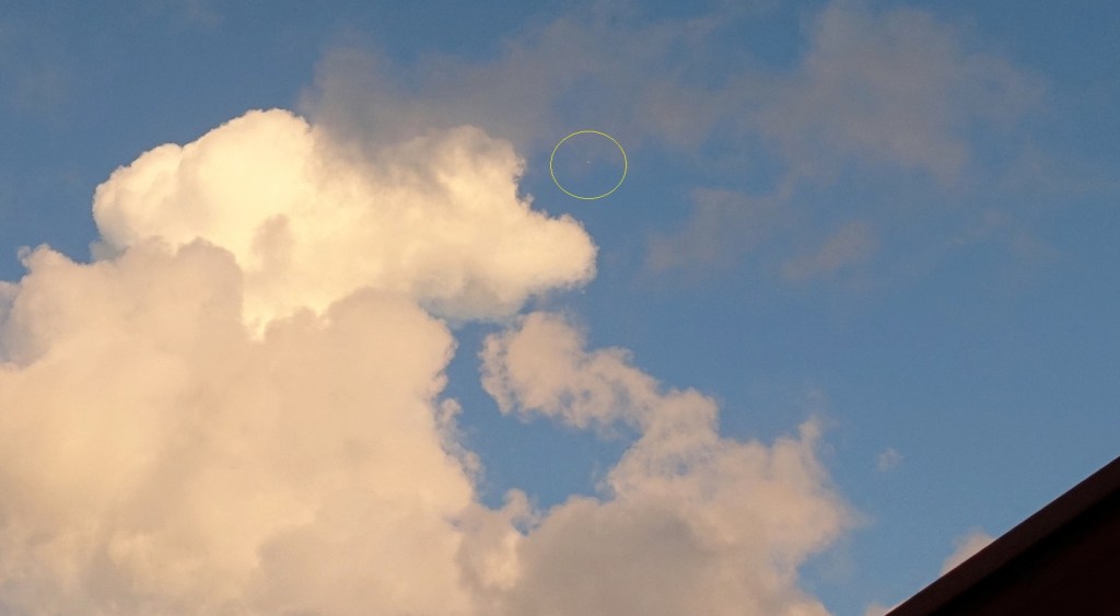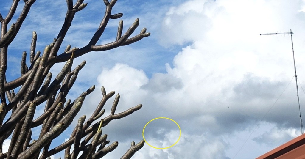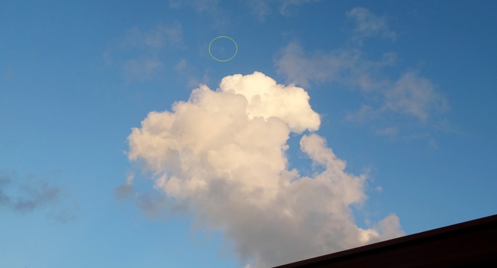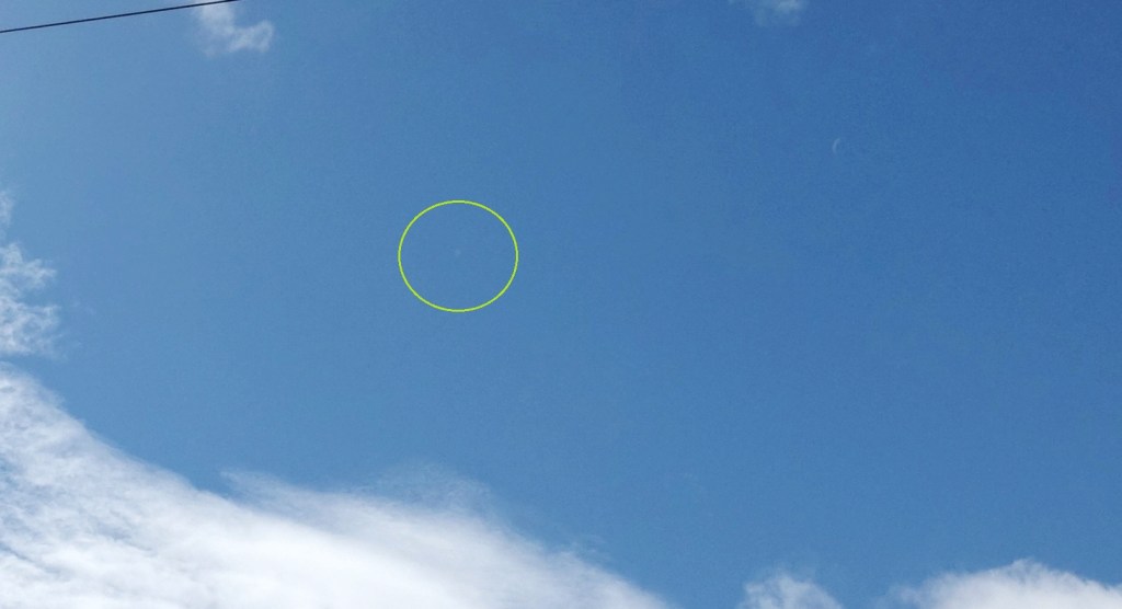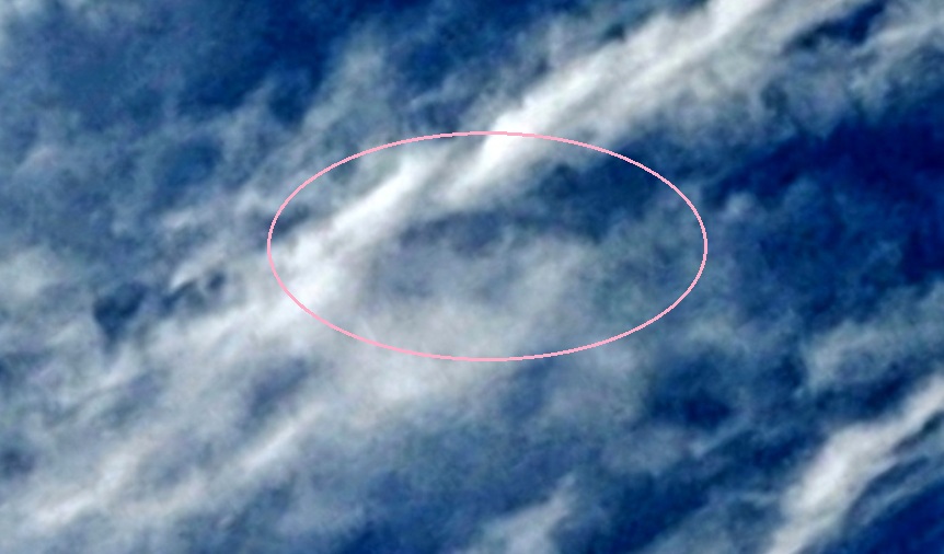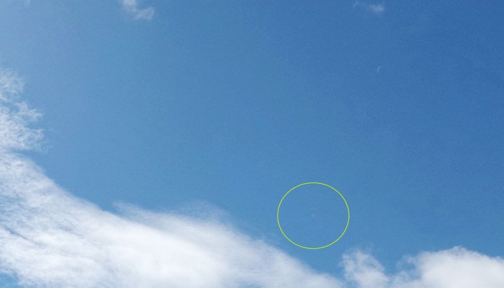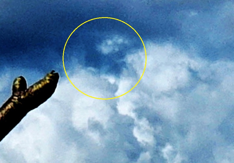 During the afternoon of March 14th, my attention was drawn to the young Moon, visible where a gap opened in the clouded sky, and Arnap flashed his pod ship right beside the Moon, then remained hovering around it with his pod semi-decloaked, partially visible (I’ve circled it in a couple of the photos below when he dipped down from the Moon toward the clouds), and giving one bright flash as he headed higher up and recloaked. He had been in my dream before waking that morning, along with two close, very dear star brothers Ka’ree and Alione, and I heard/felt greetings from them, on board the pod with Arnap that day.