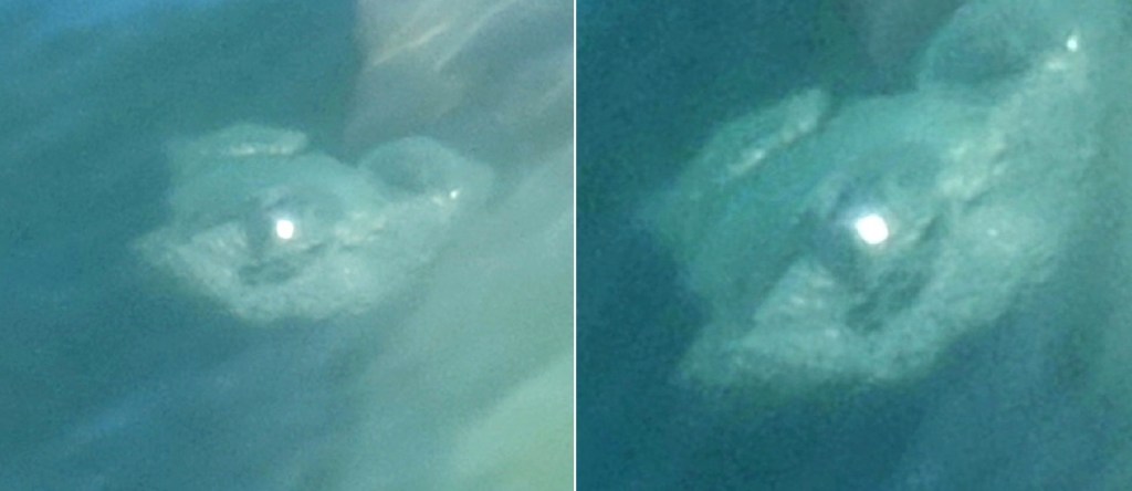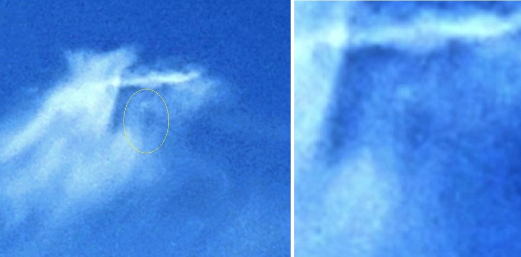 On July 24th, a cluster of ‘energetic overlays’ formed in a cloud, with a large owl-like face just above/overlighting a shiplike structure. Enlarged, the ship appears as if from front on, looking at a disc with a distinct rounded upper dome.