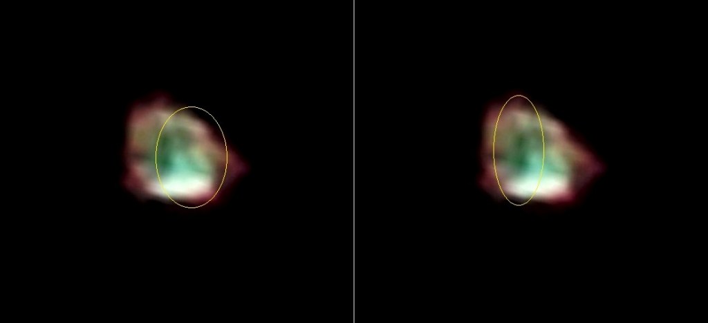 And brightening, revealing a bow-shaped form in soft golden-rose tones, as it neared the Southern Cross/Crux.