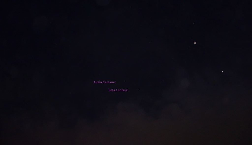 The ship they were on board flashed again, to the right of Alpha & Beta Centauri, with a bright orb flashing above it simultaneously. When enlarged, there are humanlike light-forms softly visible in the orb, and the form of the ship, at lower right, also has an energetic overlay of presences and forms.