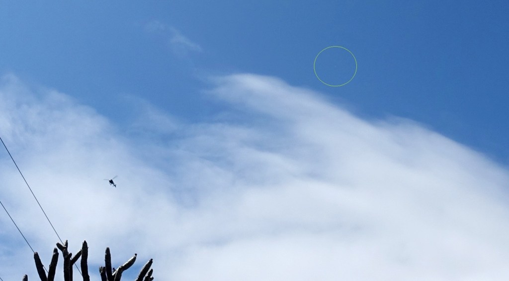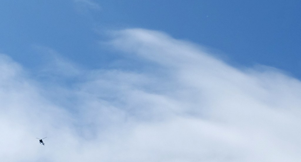 This was followed by a flurry of planes and helicopters, with this helicopter circling directly below where the ship had flashed, as the sky clouded over, with military jets sounding from above the cloud cover.