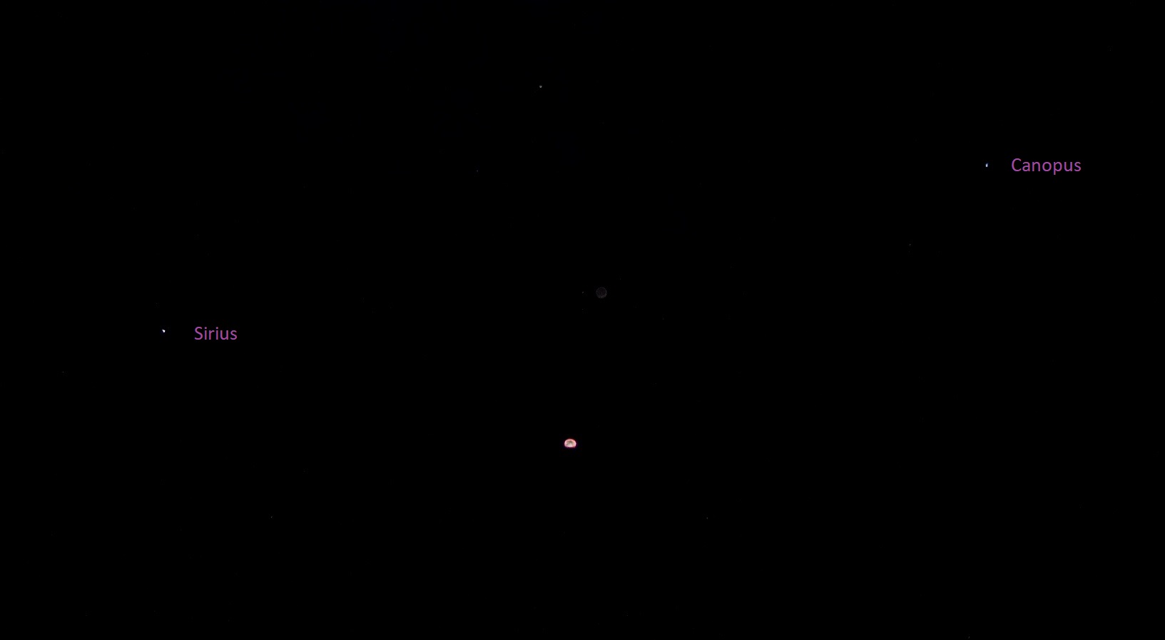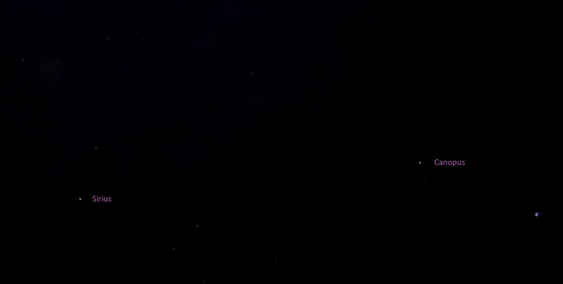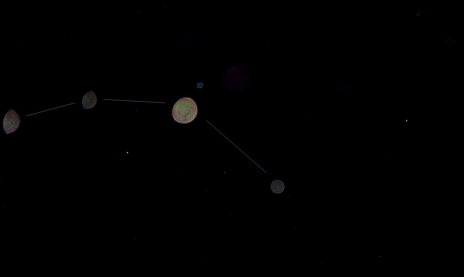 Then a beautiful arc of four orbs in perfectly graduated sizes formed between the Bow & Arrow stars and Canopus.