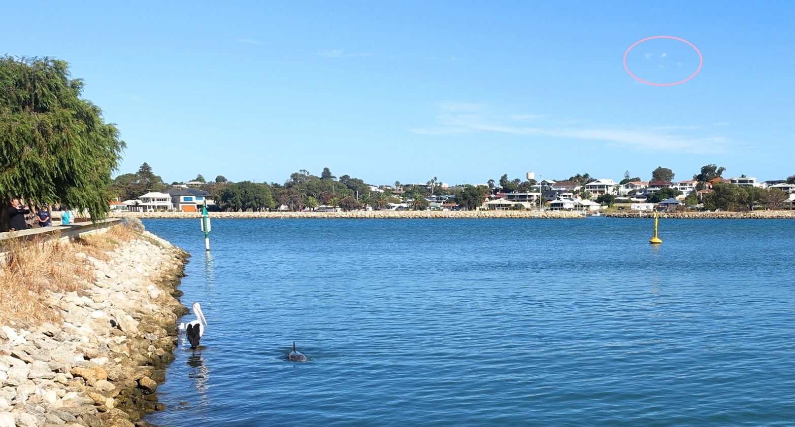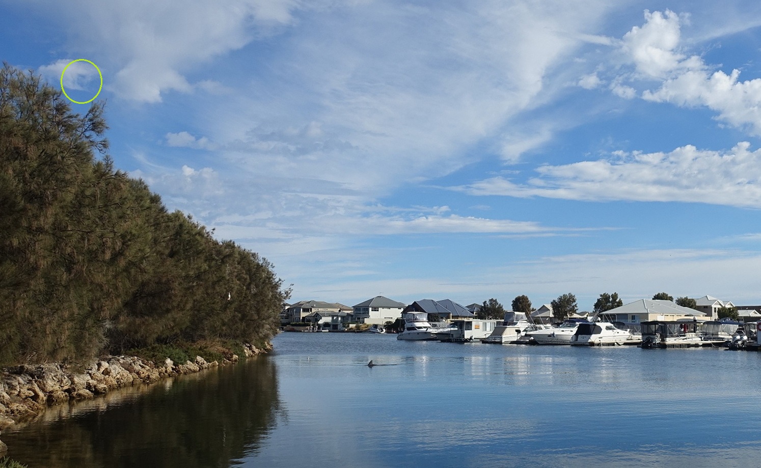 On April 23rd, another dolphin encounter came with a ship (the Lei’hua) fully decloaked for a moment, in the direction this young dolphin swam toward me in the Mandurah Marina, with a feeling of distress vibrating from him. By the time I turned my camera toward him and the Lei’hua, the ship had recloaked, with just a hint of its presence reflected in a ring of four tiny clouds arranged in a disc-shape where the ship was hovering. The little dolphin had an open wound on his dorsal fin and two long scuff marks across his upper body. A wonderful healing unfolded then, that I’ll share in more detail in a post soon. In brief, beautiful energies flowed in, and within minutes, the lovely dolphin’s dorsal fin had completely healed, without a mark, and the scuff marks become fainter, and he became very joyful, doing underwater acrobatics, and forming the ‘nebula image’ below, with a pyramid shape and subtle facial overlays within it. I’ve circled where the Lei’hua decloaked in the first photo.