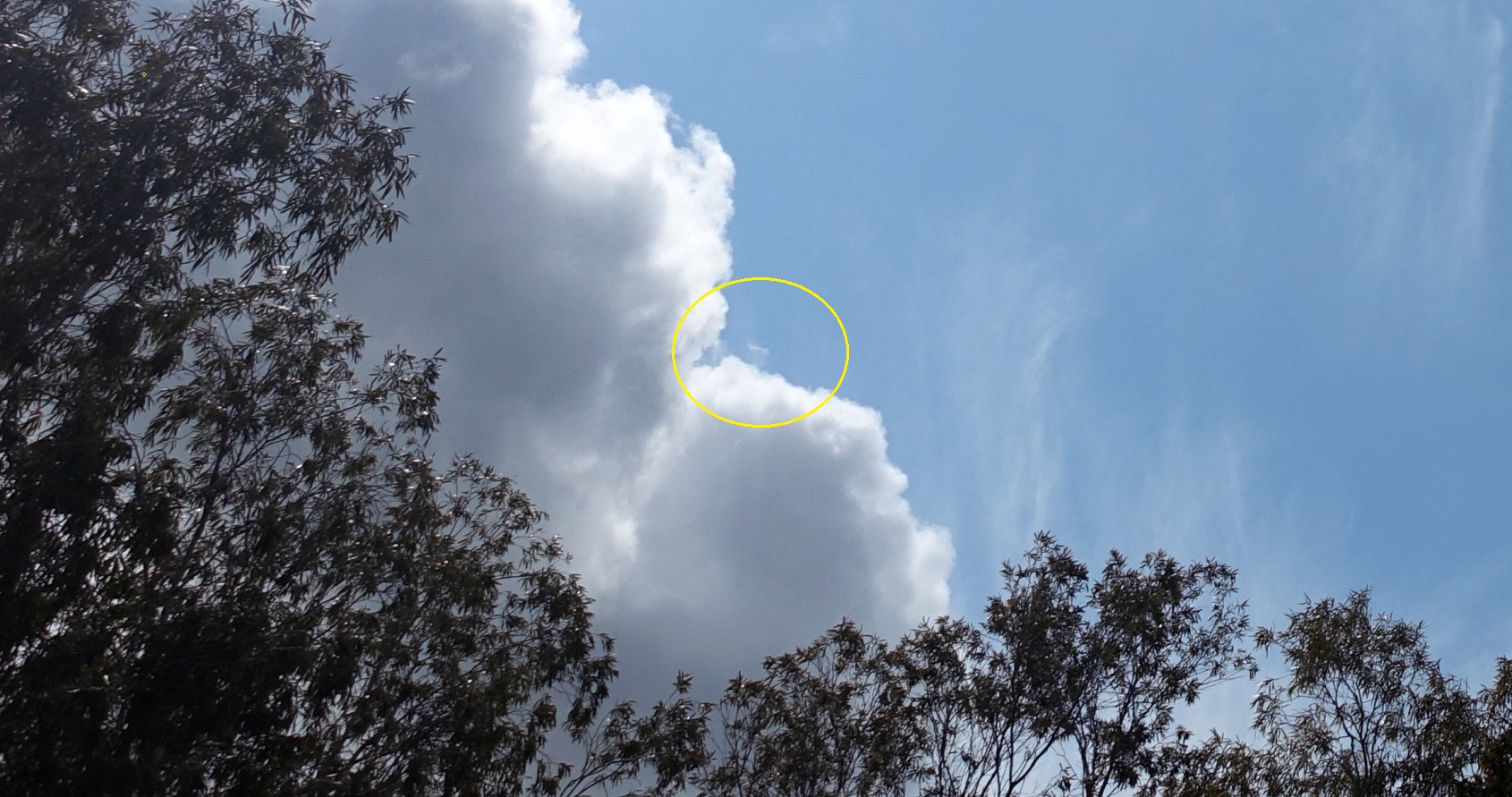 During the afternoon of March 14th, my attention was drawn to the young Moon, visible where a gap opened in the clouded sky, and Arnap flashed his pod ship right beside the Moon, then remained hovering around it with his pod semi-decloaked, partially visible (I’ve circled it in a couple of the photos below when he dipped down from the Moon toward the clouds), and giving one bright flash as he headed higher up and recloaked. He had been in my dream before waking that morning, along with two close, very dear star brothers Ka’ree and Alione, and I heard/felt greetings from them, on board the pod with Arnap that day.