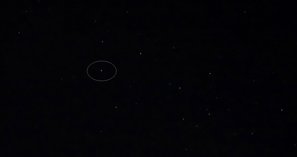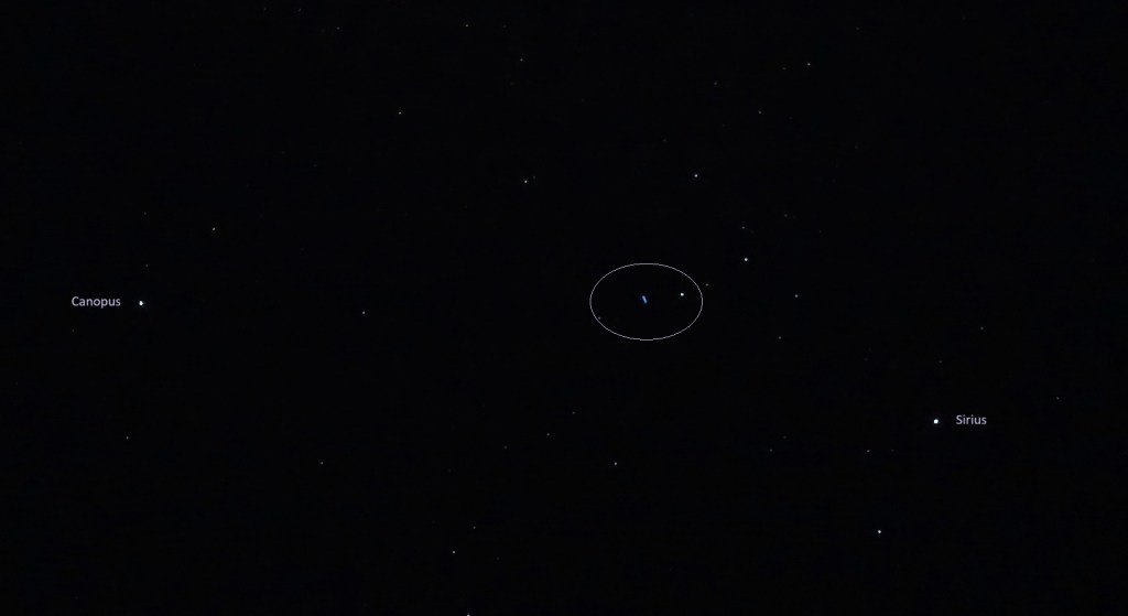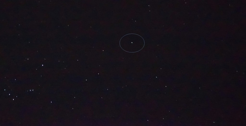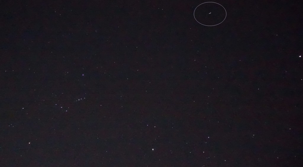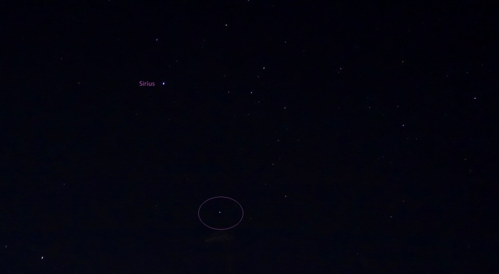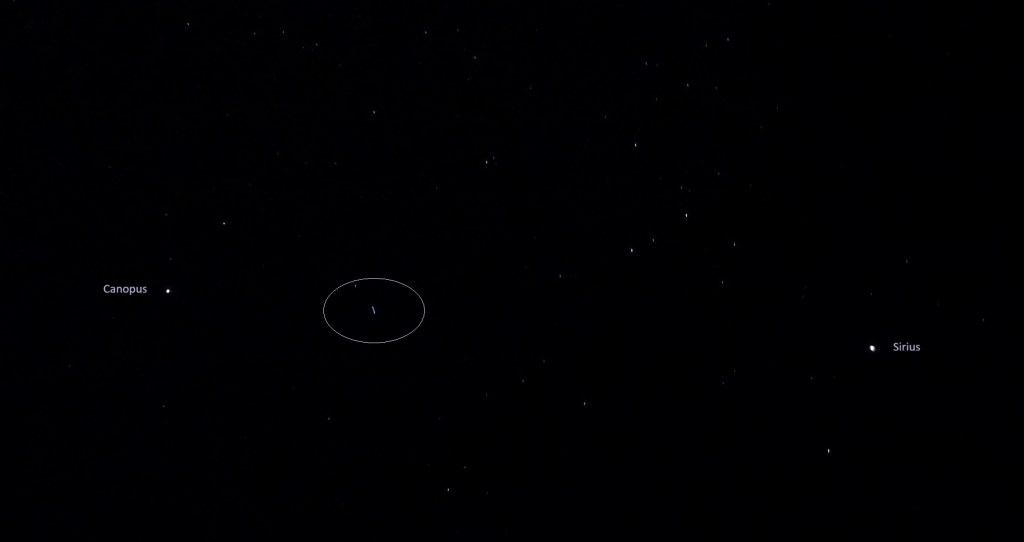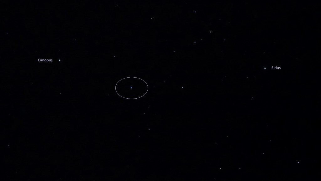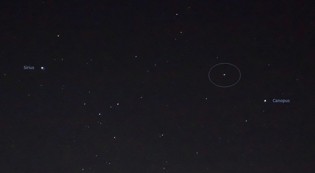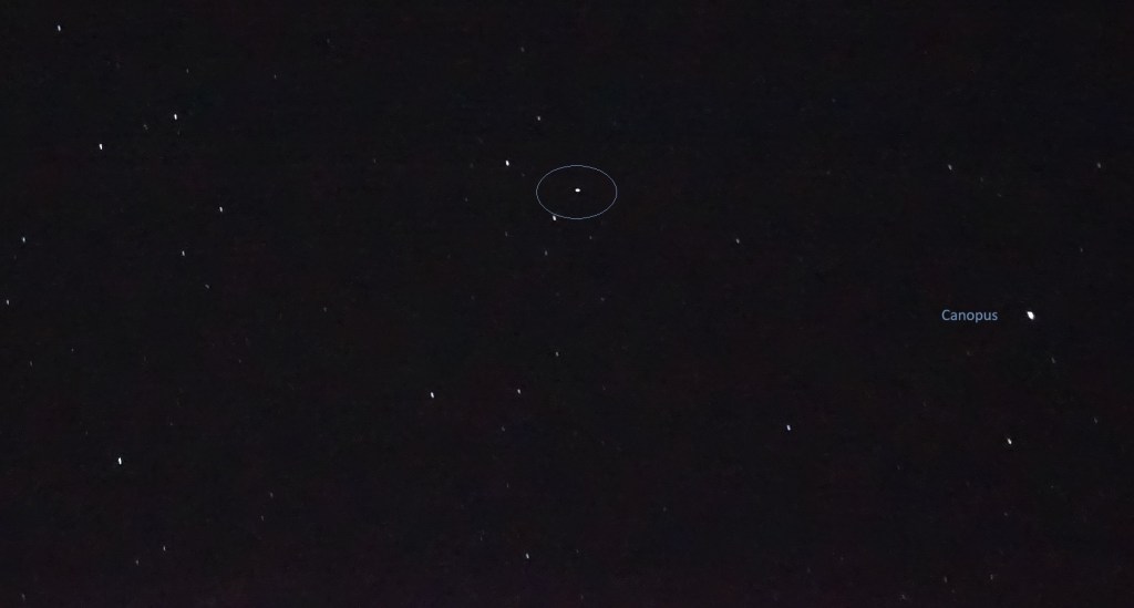 The Lei’hua then flashed brightly above the ‘bunny stars’ (directly above Arneb, alpha star of the Lepus constellation), winking there for a few moments before heading down toward Canopus, shifting between white and soft pink hues.