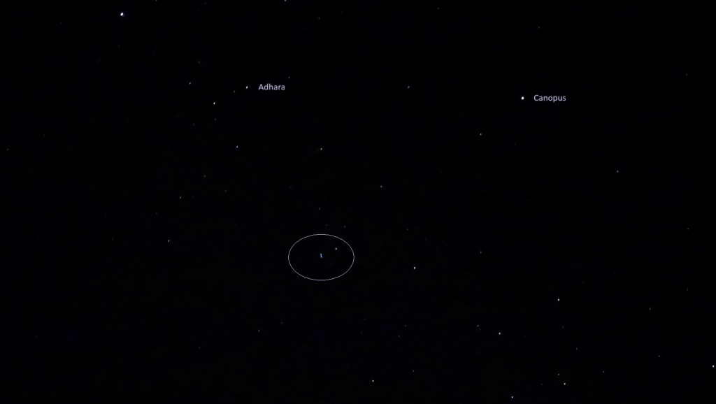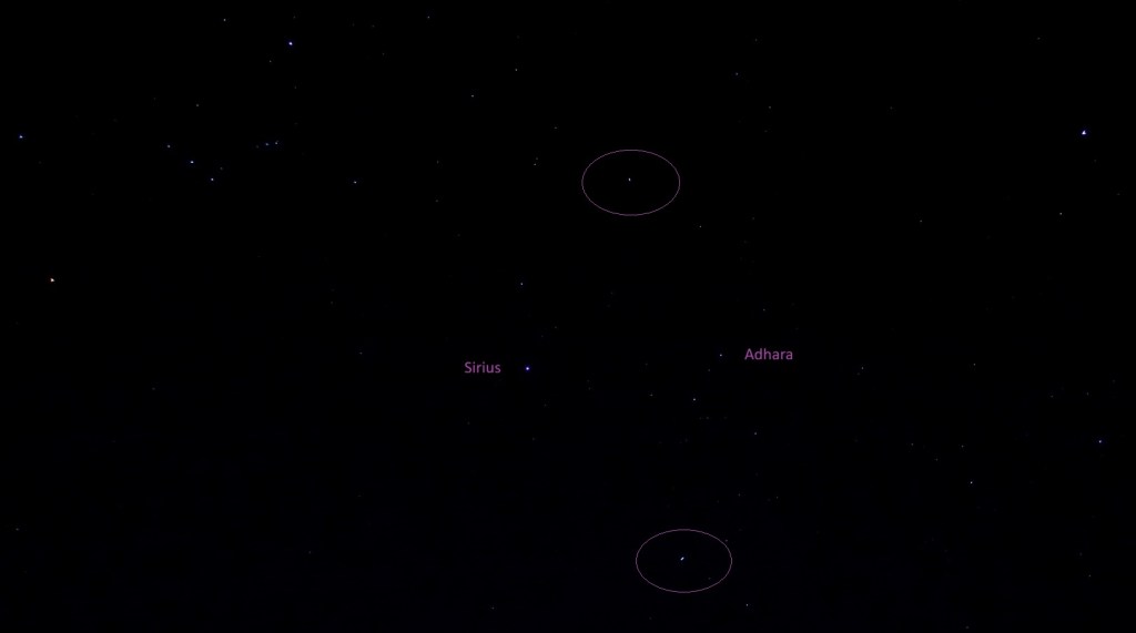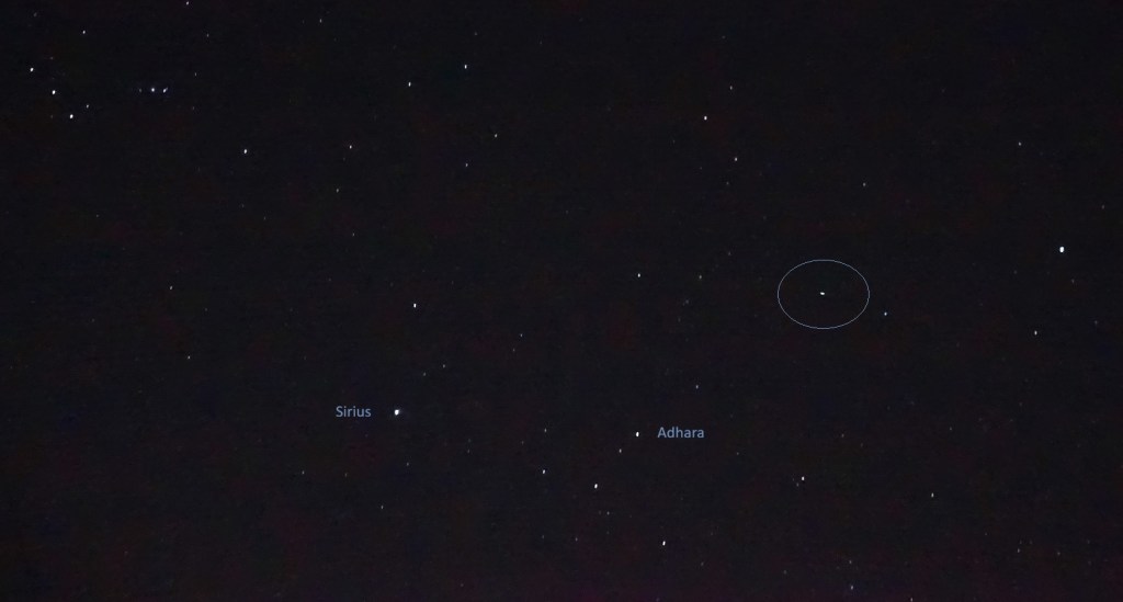 Flowing on from introducing themselves in the last two months of 2025, with the lightship Ama’dhaera here very frequently, Manu&Mu’ara (of an Agarthan light-realm they call Aman Lac) have been powering into this year, with the Ama’dhaera visible most nights and occasionally by daylight. This beautiful ship is often here in tandem with the Lei’hua (see this page), and I’ll post in more detail about their connection soon. Here they are together on the night of January 6th, with the Ama’dhaera flying firstly between Sirius and Canopus then down toward the star Adhara, marked on the photos below. You can see her shifting between bright white light and clear green tones in this sequence, then recloaking just as she visually ‘touched’ the star Adhara,