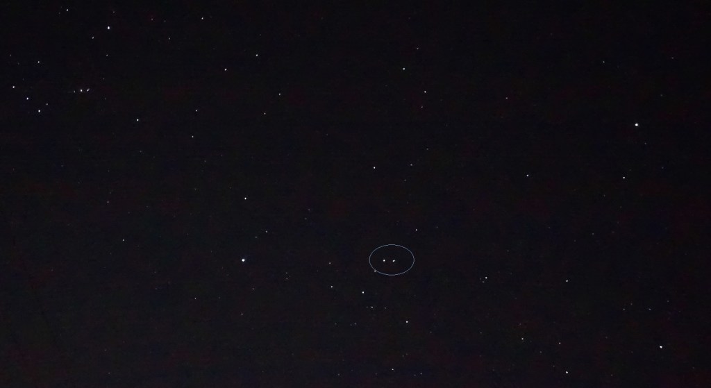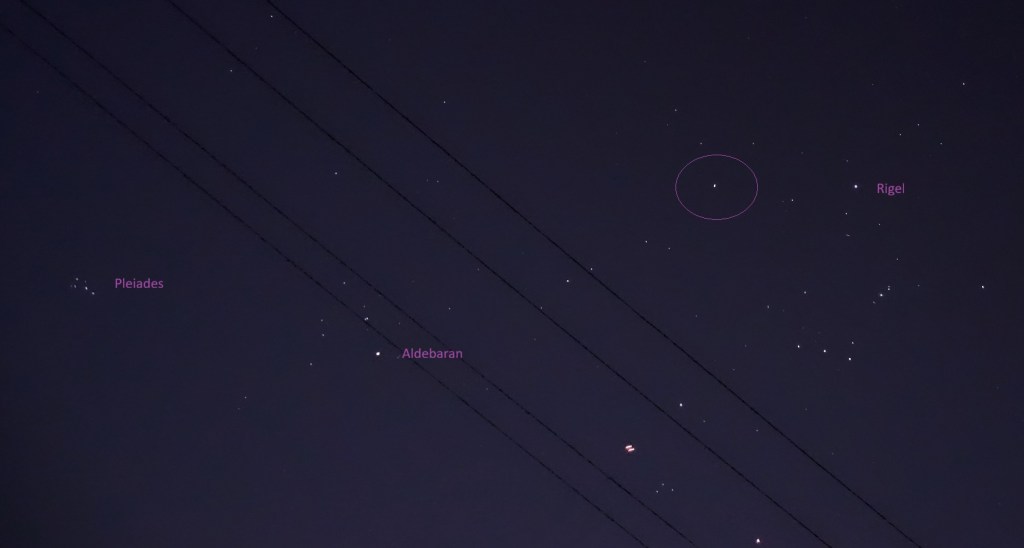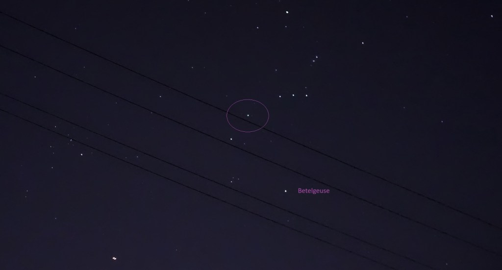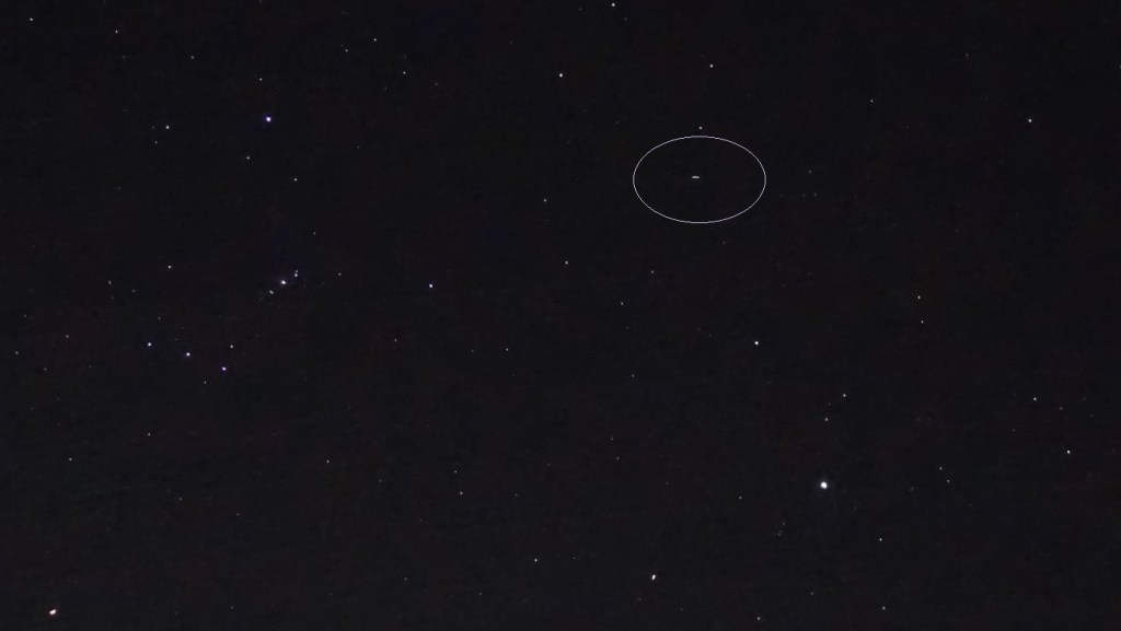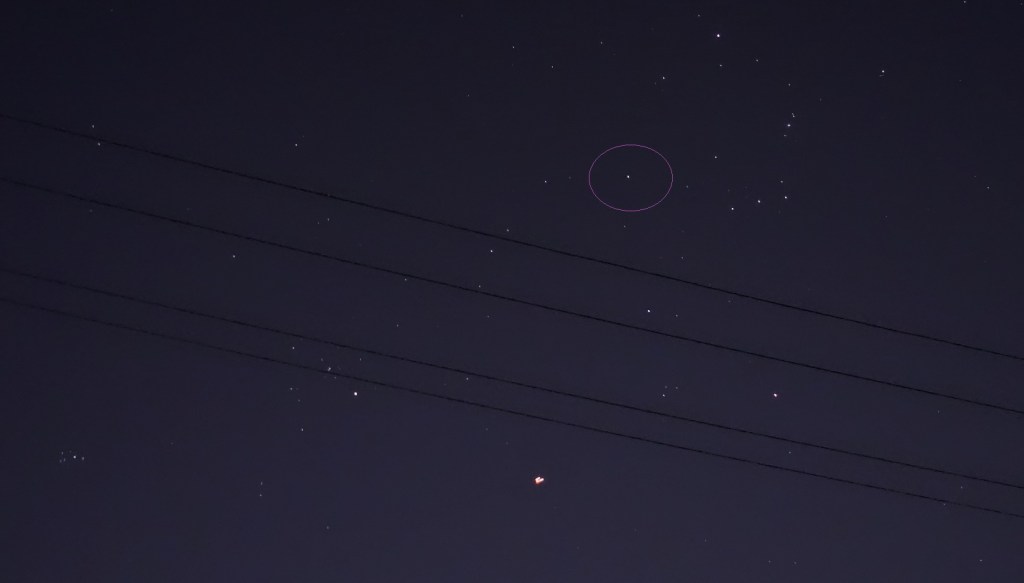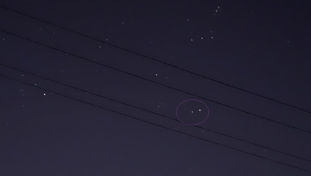 There was a lot of Star Family focus around the star Bellatrix in Orion that night (and ongoing), defusing and clearing some shadowy influences connected with that star, and just before the Lei’hua decloaked, a plane flew straight down the alignment of Sirius ~ Bellatrix ~ Aldebaran ~ Pleiades. Here it is passing the Pleiades.