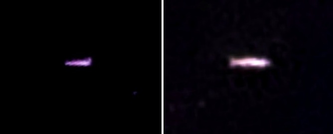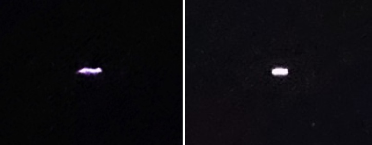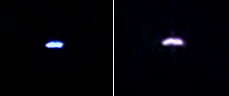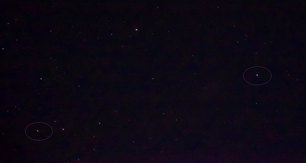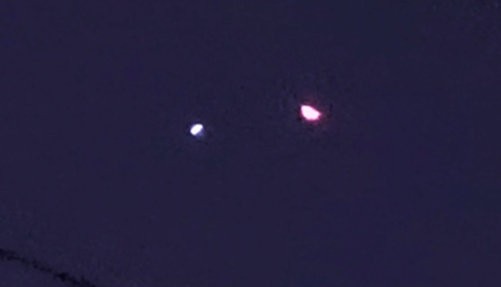 The next night, on January 14th, the Lei’hua and the Ama’dhaera flashed into view simultaneously, with the Lei’hua appearing up high among the ‘bunny stars’ and the Ama’dhaera about halfway between Betelgeuse and Sirius, lower in the sky. As you can see in the photo sequence below, they moved in completely synchronized motion, like a beautiful dance with the Lei’hua above and the Ama’dhaera flying below. I’ve paired the cropped photos of them below, with the Ama’dhaera at the left and the Lei’hua at the right in each pair, so you can see the light/colour spectrum they were shifting through together,