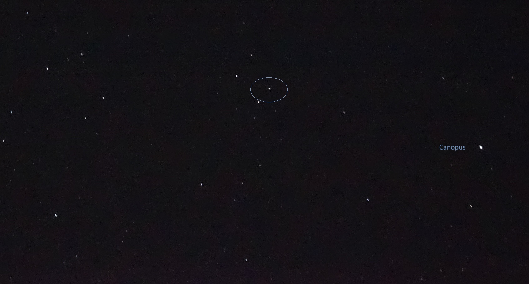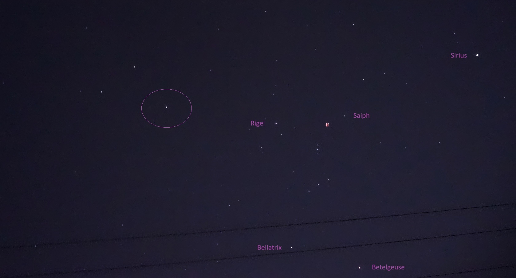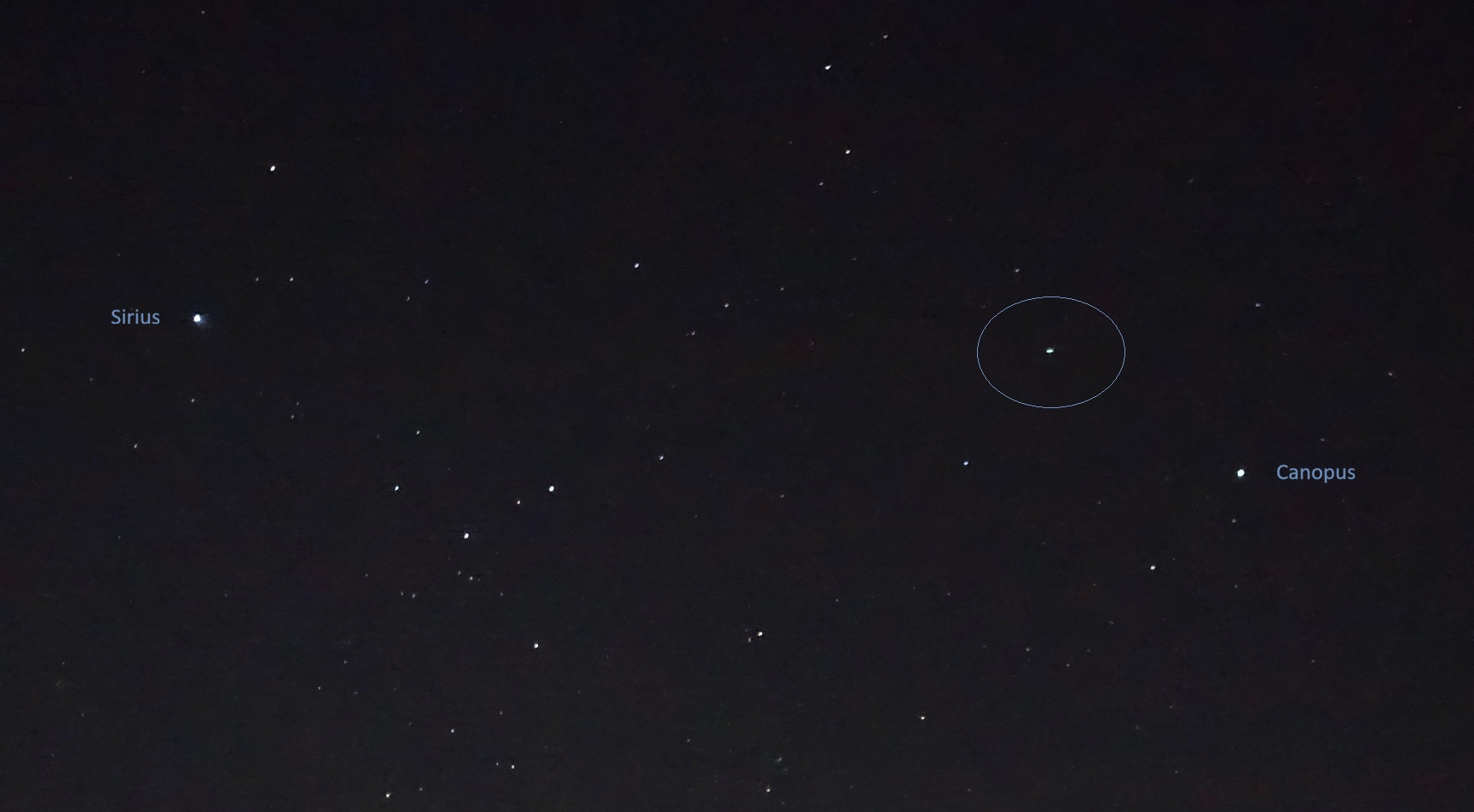 The Lei’hua then flashed brightly above the ‘bunny stars’ (directly above Arneb, alpha star of the Lepus constellation), winking there for a few moments before heading down toward Canopus, shifting between white and soft pink hues.