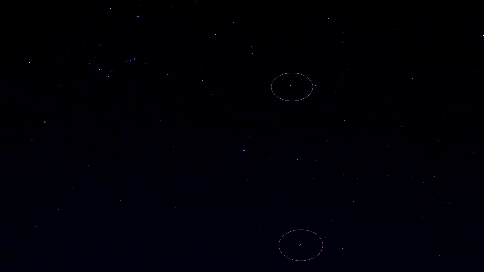 The next night, on January 14th, the Lei’hua and the Ama’dhaera flashed into view simultaneously, with the Lei’hua appearing up high among the ‘bunny stars’ and the Ama’dhaera about halfway between Betelgeuse and Sirius, lower in the sky. As you can see in the photo sequence below, they moved in completely synchronized motion, like a beautiful dance with the Lei’hua above and the Ama’dhaera flying below. I’ve paired the cropped photos of them below, with the Ama’dhaera at the left and the Lei’hua at the right in each pair, so you can see the light/colour spectrum they were shifting through together,