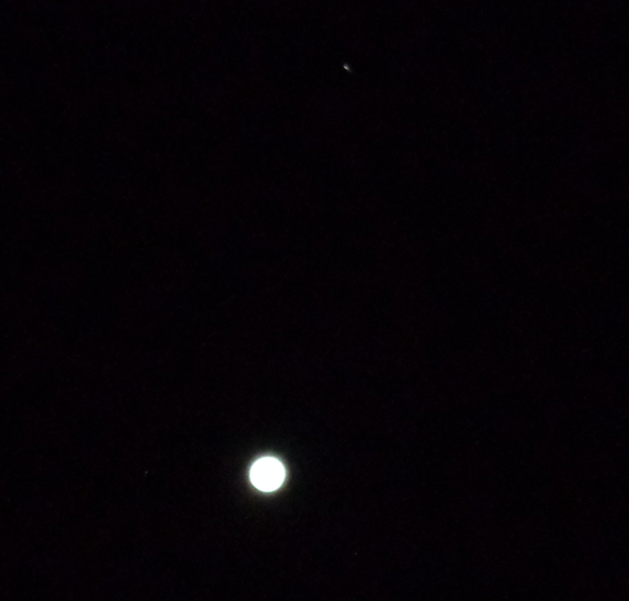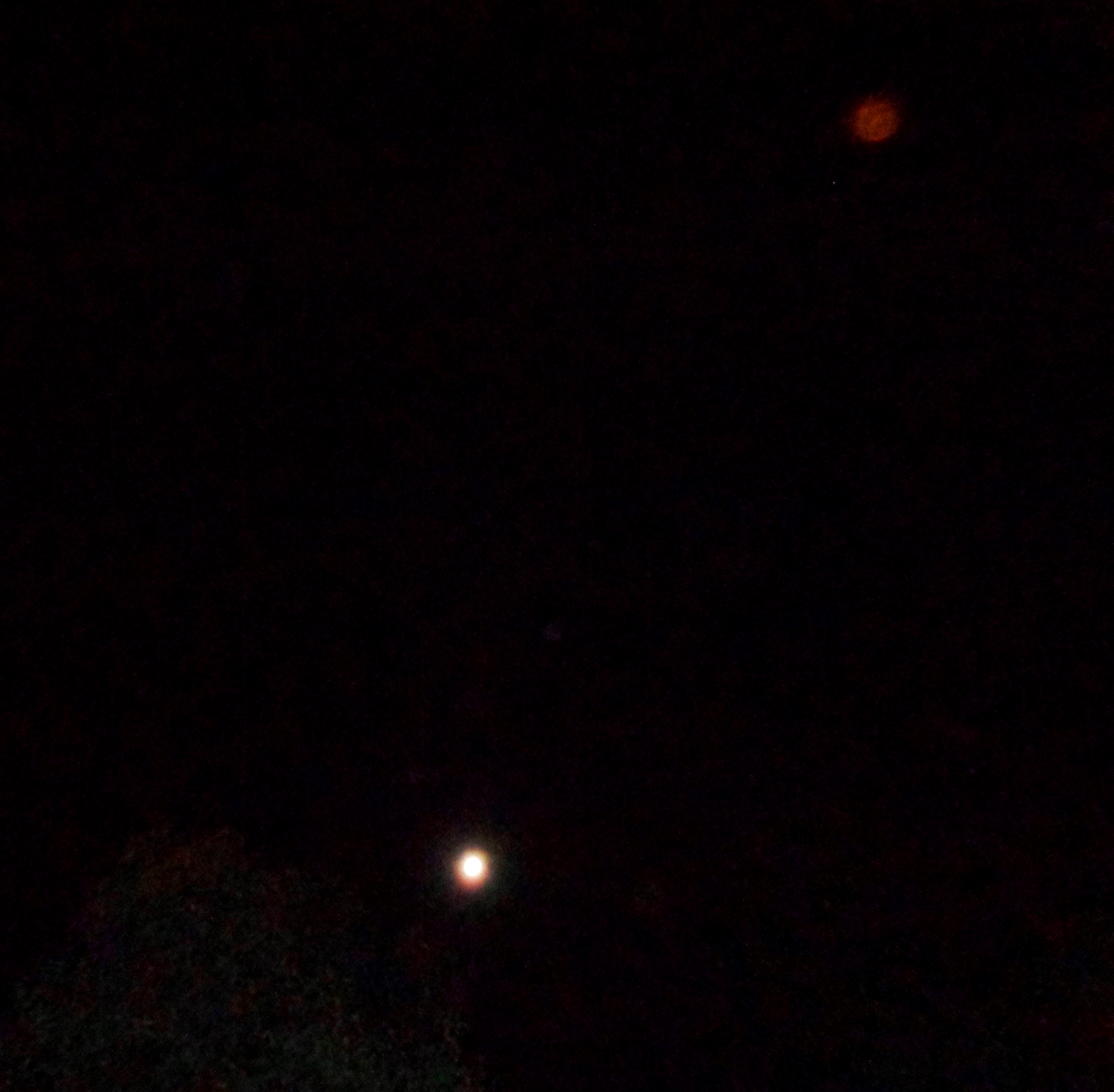 On a third full moon in sequence, Christmas Night, December 25th 2015, their orb appeared in straight alignment to the moon, with the star Sirius in between. In the enlargement below, Sirius is the little point of white light below the Antares orb, depicting the star Antares’ relative size to Sirius.