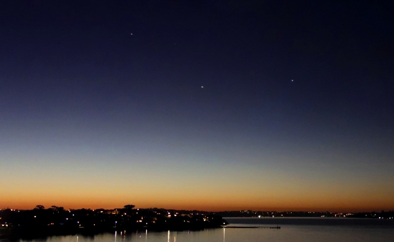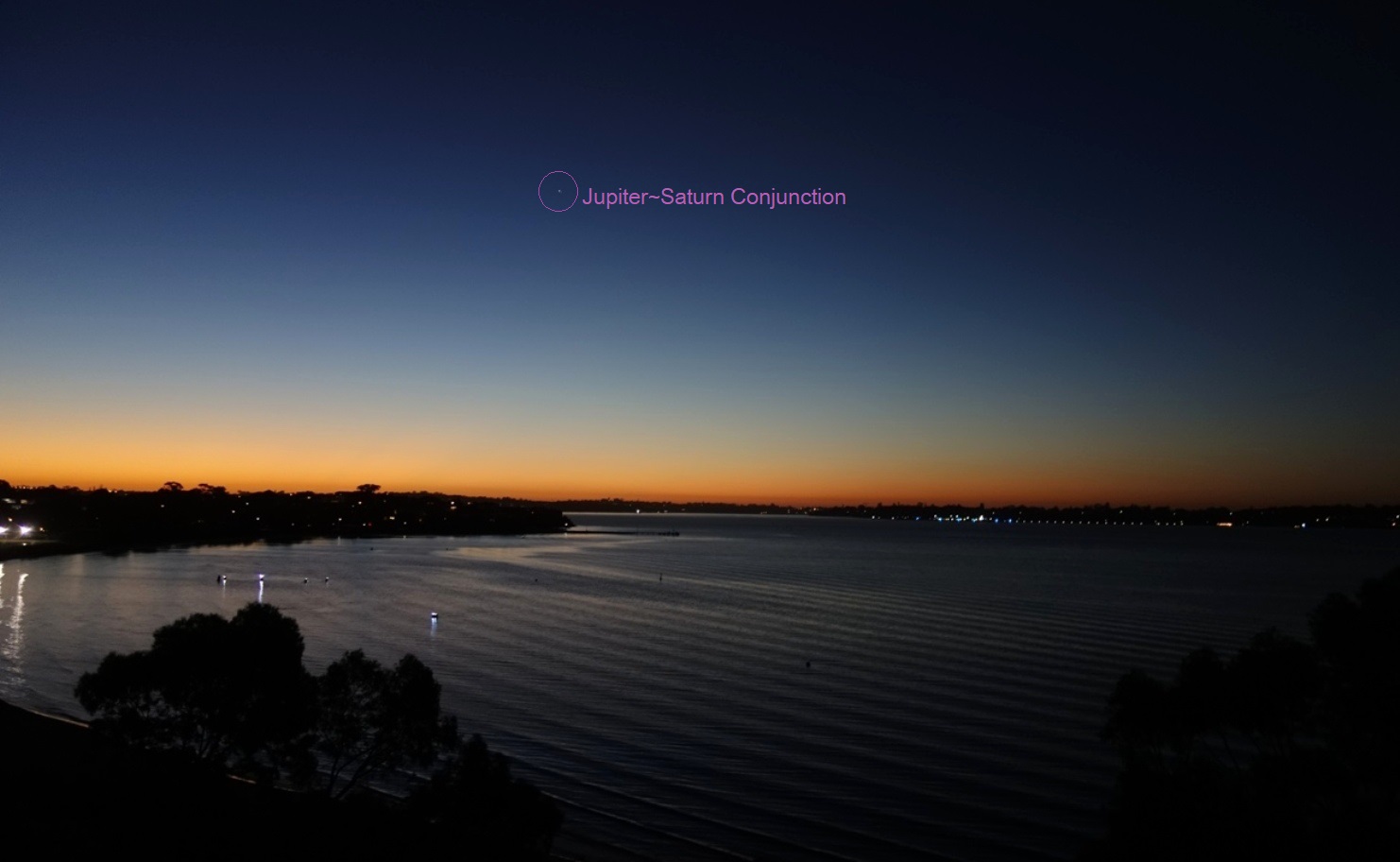 Here’s how the conjunction of Jupiter&Saturn appeared from a high vantage point by the Swan River in Perth, Western Australia. The energies felt soft and peaceful at the peak of the Conjunction, with ships flanking the planets from either side in a precise triangulation of the energies, from the Jupiter Command and Saturn Command (local wings of the Ashtar Command in the Solar System).