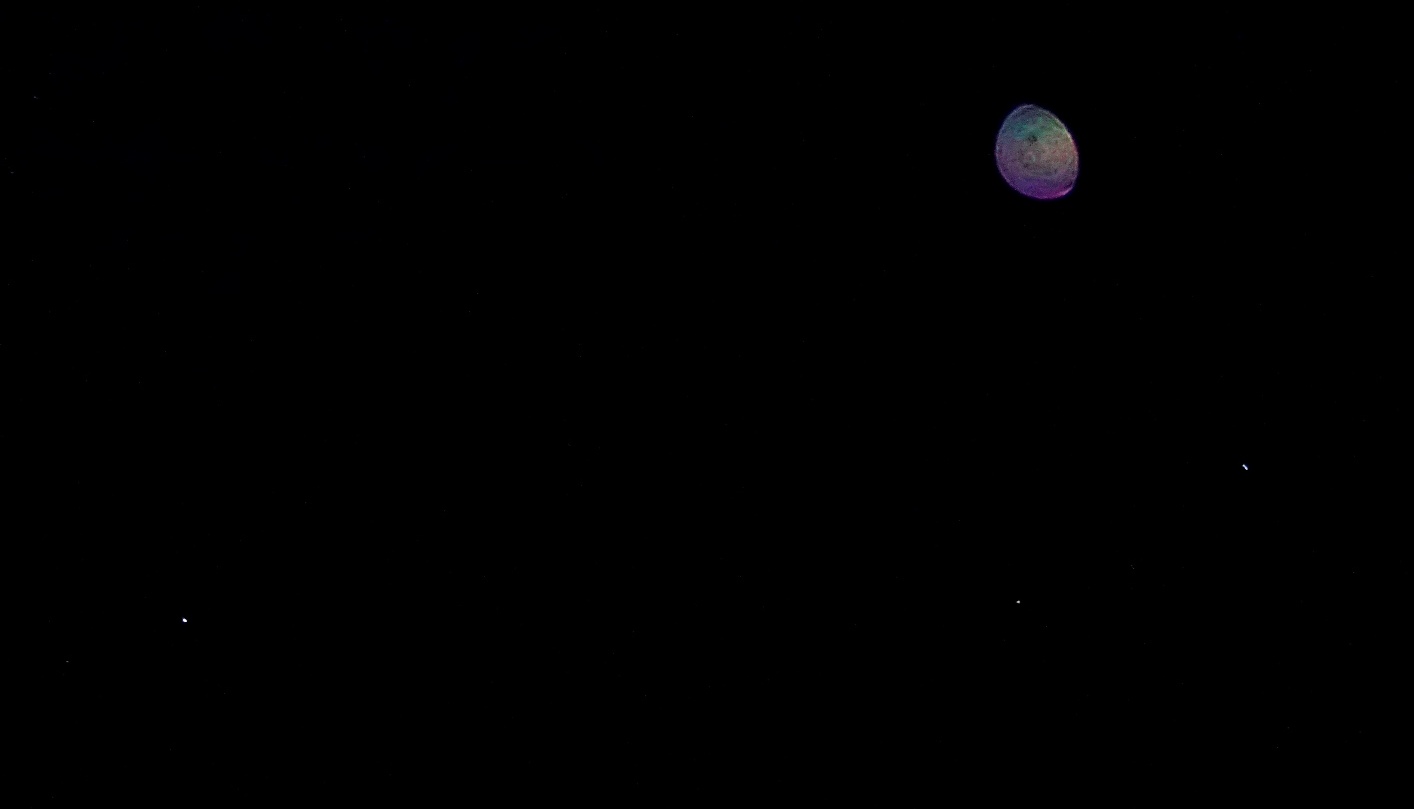 As this ship circled to the east of Alpha & Beta Centauri, an orb flashed very brightly above it, holding a position in which ship and orb mirrored the two stars. With the brightness reduced in the crop of the orb below, several tall figures are visible, and the ship, when enlarged, has revealed its exterior shape, semi-translucent and lit with a soft pink and green glow from within.
