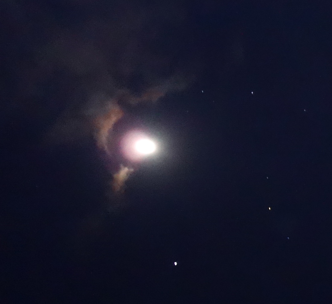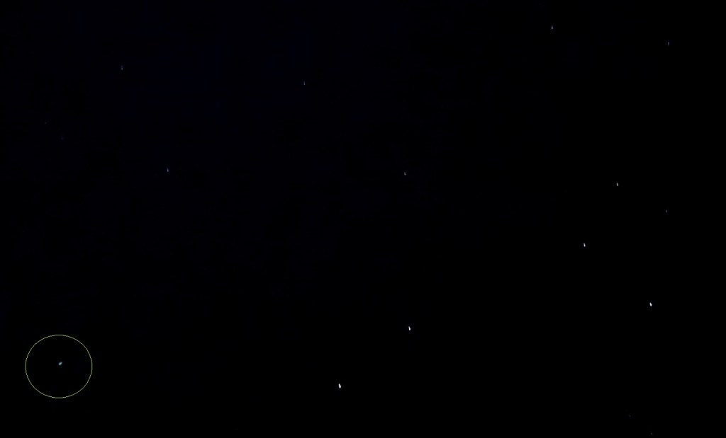 In the southern sky, a lot of Star Family to’ing and fro’ing continues around the star Canopus, and this beautiful rainbow orb to the left of Canopus on January 21st was followed by a detailed photo, with a lit triangular interior view of a lightship at the foot of the frame, flying upward behind a spray of grey pods which it ‘herded’ toward the star.