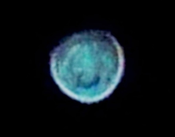 In the enlargement, two distinct soul group vibrations can be seen coming through this orb, melded together in unity, with a face in purple-blue light on the left, showing leonine-humanoid features, and the face on the right in royal blue and light blue, with cow horns. 🙂